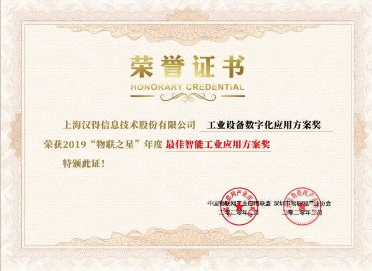 2020年2月25日,经过4个月的申报、专家评审、公示等环节,2019年物联之星中国物联网行业年度评选获奖名单正式公布。上海k8凯发官网信息技术股份有限公司荣获工业设备数字化应用方案奖—— 2019“物联之星”年度最佳智能工业应用方案奖。中国物联网最佳智能工业应用方案k8凯发官网智能工业应用方案,凭借自身在工业信息化领域拥有多年的技术经验,结合k8凯发官网物联网中台Hi-IoT平台,为企业提出多场景解决方案,帮助企业构建工业物联网平台,解决设备管理、数据采集、设备监控、故障诊断、预测维护等一系列痛点。同时,针对工业设备及产品数字化管理的产品组合,提供端到端的一体化解决方案:“设备健康管理”等SaaS应用 +