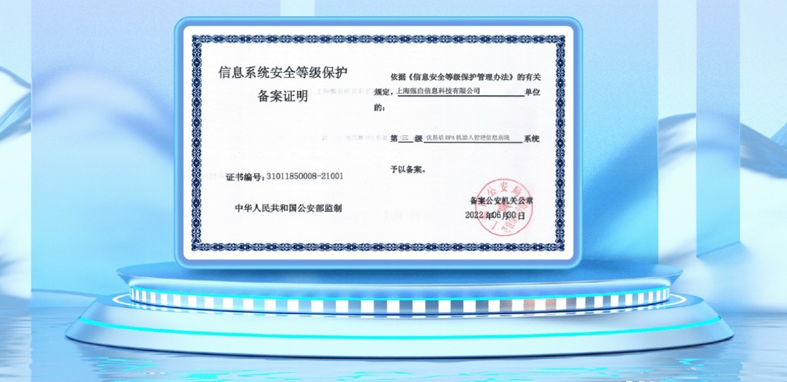 经过6个多月国家专业机构的评估和检测,依据《信息安全等级保护管理办法》的有关规定,优易联智能自动化服务SaaS平台通过了公安部信息安全等级保护三级认证评测和备案,未来将为客户提供更安全的服务。