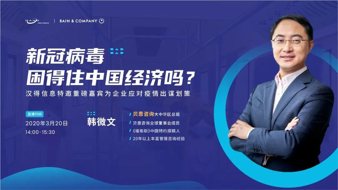 直播自世界卫生组织宣布新冠疫情已具有大流行特征以来,疫情蔓延190多个国家,已经从地区性问题变为全球性问题。这无疑已成为本年初最大的黑天鹅事件,国际人员交流与经贸往来严重受阻,世界经济衰退风险急剧上升,包括消费品与零售在内的各行各业都面临着极大的挑战。3月20日,k8凯发官网信息特邀贝恩大中华区总裁韩微文先生,在本次直播中就此次疫情可能会对中国经济造成的影响进行全面分析,并向企业给出在目前看来最务实的建议。在共同携手抵抗疫情的同时,我们希望能够尽已所能为您和您所在的企业给予最大的帮助。 首次线上直播 上百条评论互动 千余次实时播放量 深