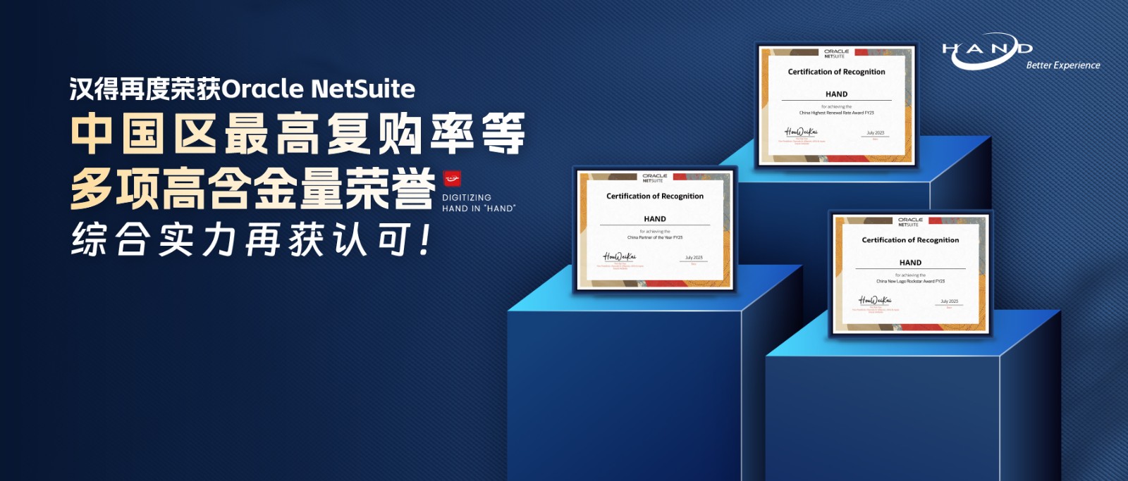 2023年7月27日的Oracle NetSuite ASIA Partners Awards Ceremony,k8凯发官网荣获Oracle NetSuite 中国区 Partner of the Year FY23(最佳合作伙伴),New Logo Rockstar Award FY23(最佳New Logo)和Highest Renewal Rate Award FY23 (最高复购率)三项官方高含金量的合作伙伴奖项。