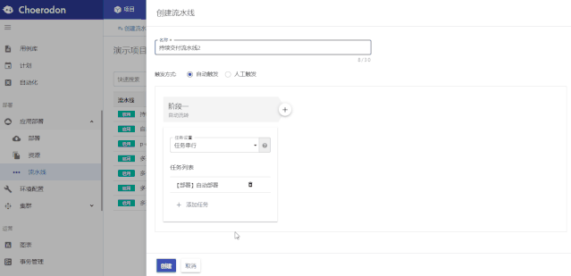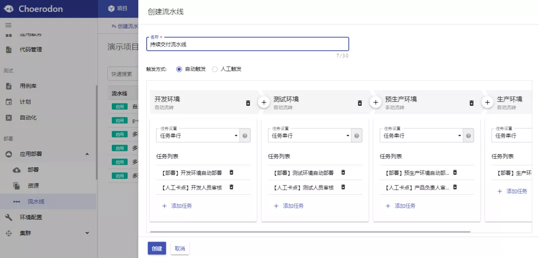 首先在“部署-应用部署-流水线”菜单页面,点击创建流水线,此时出现下图的流水线创建页面。项目人员可在此按需求定义多个流水线阶段,同时也可在各阶段中定义多个任务。