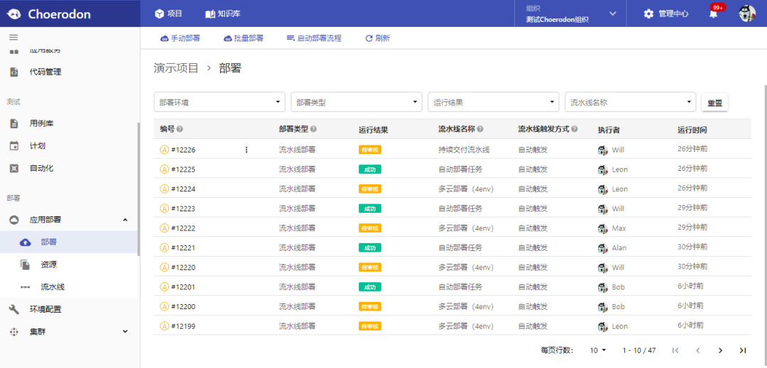 在“应用部署-部署”菜单页面,项目人员能在列表中查看到流水线部署记录的编号、对应的流水线名称、触发方式、执行者、运行时间以及运行结果;目前,运行结果存在以下几种情况: