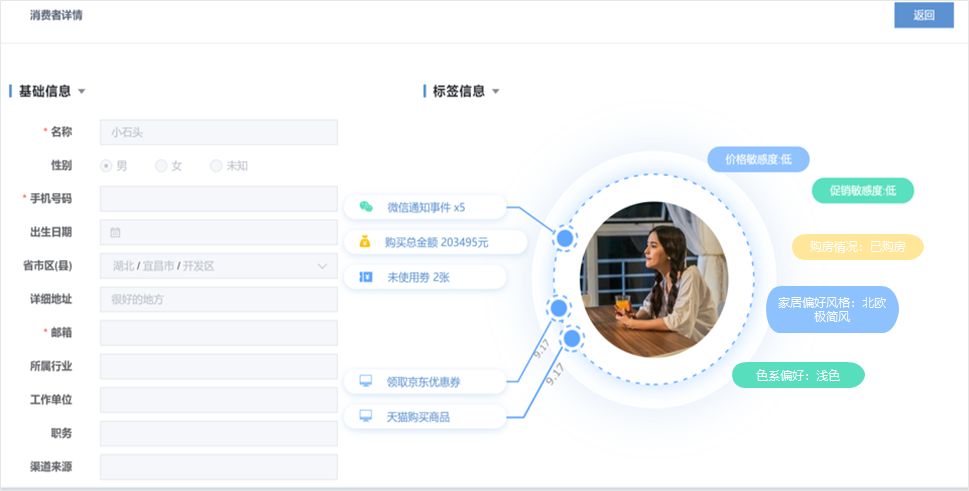 疫情之下,导购无法与消费者面对面沟通交流。导购助手与企业微信相结合,帮助企业统合各渠道消费者信息,构建全渠道消费者数据,定制个性化消费者标签,最大限度还原消费者画像,辅助导购线上认知消费者,进行精准营销。