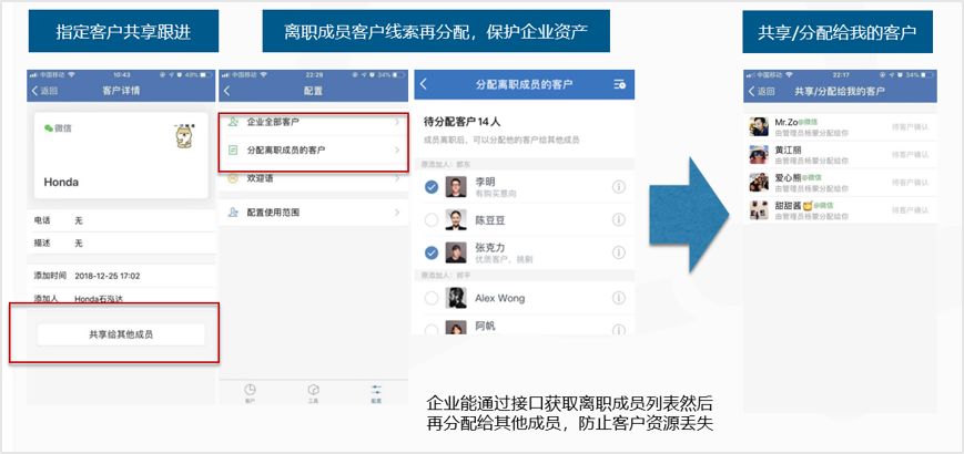 同时,企业微信支持离职继承客户和共享客户信息,可以保证导购离职或转岗后客户关系的存续,沉淀和保护品牌客户资产。