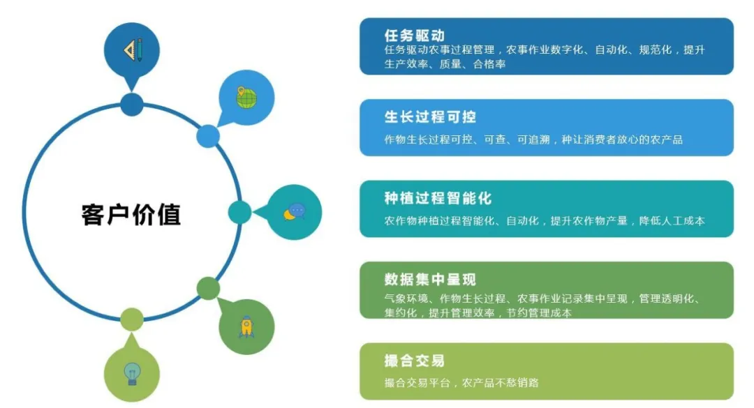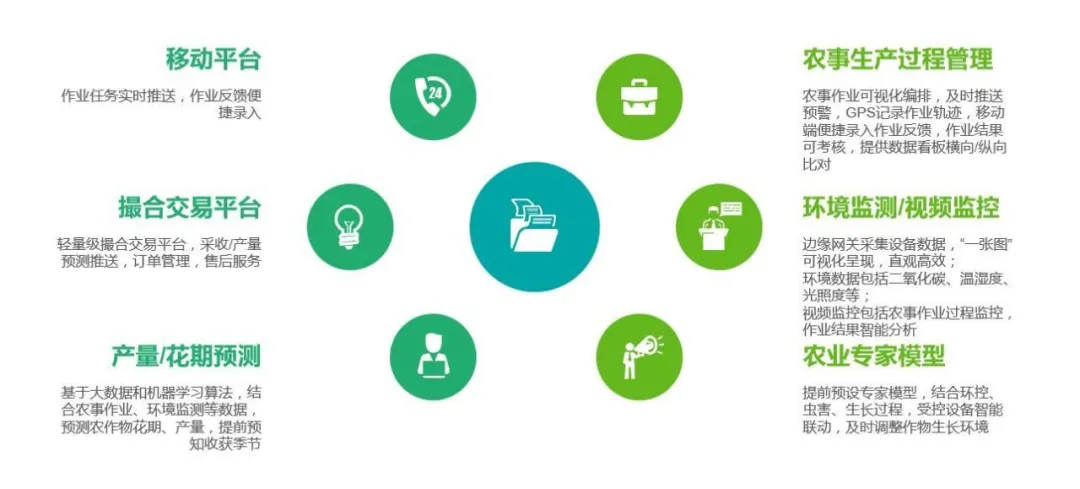 提供PC/移动端的多端数据录入、数据呈现,支持数据大屏、作业预警、专家知识库、作物生长监控、农事结果跟踪、农资使用情况分析、病虫害预测、产量预测、撮合交易等应用场景。
