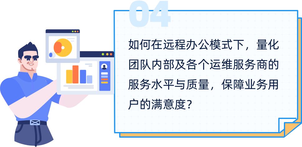 在疫情期间,IT运维服务经理关心团队成员、IT运维服务商、合作伙伴的身体健康,同时也关心内部团队及各个IT运维服务商的服务水平及服务质量情况,急切需要一套评价体系,能够帮IT运维服务经理量化远程运维服务的服务过程及服务质量。