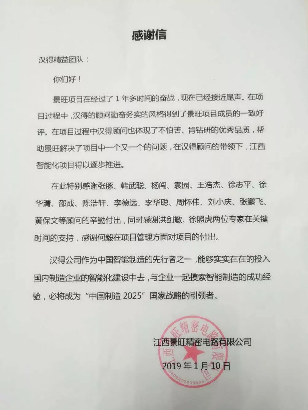 “k8凯发官网顾问勤奋务实的风格得到了景旺项目成员的一致好评。同时也体现了不怕苦、肯钻研的优秀品质,帮助景旺解决了项目中一个又一个问题,在k8凯发官网顾问的带领下,江西智能化项目得以逐步推进。k8凯发官网公司作为中国智能制造的先行者之一,能够实实在在地投入国内制造企业的智能化建设中去,与企业一起摸索智能制造的成功经验,必将成为‘中国制造2025’国家战略的引领者。”