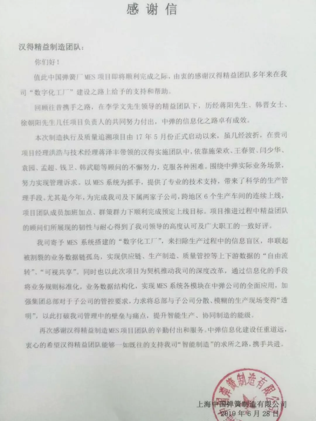 “通过本次项目的实施,我们深刻感受到了贵公司团队的专业性,以及认真负责的工作态度,是本次项目成功的有力保障。在此衷心感谢整个项目组在实施期间作出的巨大贡献。我们真诚希望能与贵司建立更加长久紧密而愉快的合作关系,共同携手,迈向更高台阶,不断取得智能制造建设新成就!”