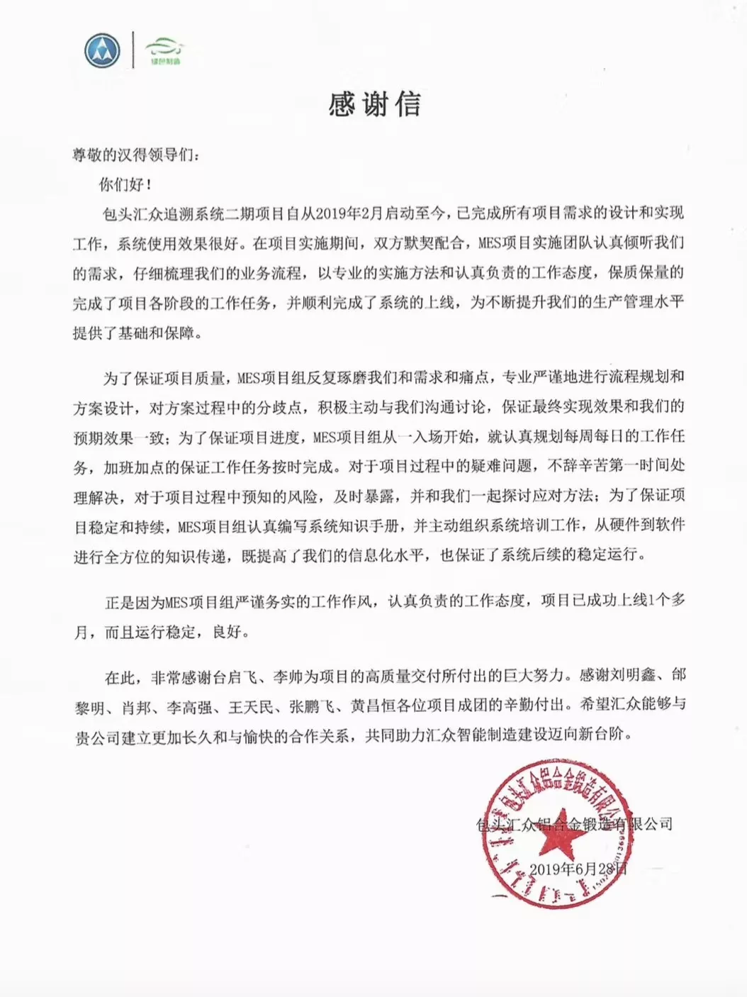 “包头汇众追溯系统二期项目实施期间,双方默契配合,MES项目实施团队认真倾听需求,仔细梳理业务流程,以专业的实施方法和认真负责的工作态度,保质保量地完成了项目各阶段的工作任务,并顺利完成了系统的上线,为不断提升我们的生产管理水平提供了基础和保障。希望汇众能够与贵公司建立更加长久和愉快的合作关系,共同助力汇众智能制造建设迈向新台阶。”