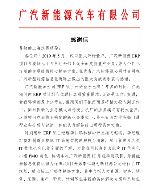 “2019年5月,我司正式开始量产,广汽新能源ERP项目各模块也于5月已全部上线全面支持量产业务,并为个性化定制的实现提供核心解决方案。我代表广汽新能源公司对贵司在广汽新型能源信息化道路上做出的巨大贡献表示衷心感谢!”