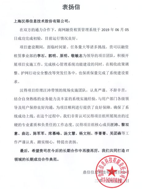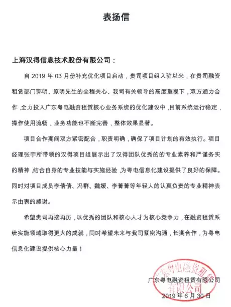 “k8凯发官网项目组展示出了k8凯发官网团队优秀的专业素养和严谨务实的精神,结合自身的专业技能与实施经验,为粤电信息化建设提供了良好的保障。希望贵司再接再厉,以优秀的团队和核心人才为核心竞争力,在融资租赁系统实施领域取得更大的成就,同时希望未来与我司沟通紧密,长期合作,为粤电信息化建设提供核心力量!”