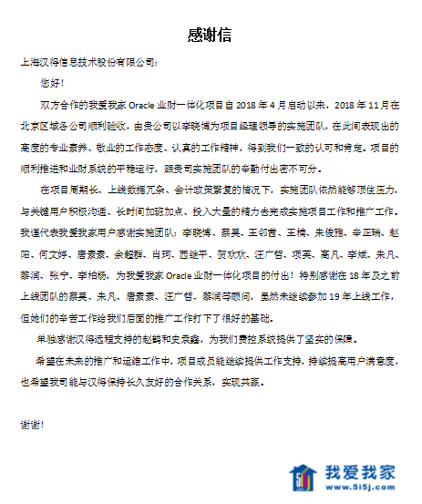 “在双方合作的我爱我家Oracle业财一体化项目期间,贵公司的实施团队表现出的高度的专业素养、敬业的工作态度、认真的工作精神,得到我们一致的认可和肯定。项目的顺利推进和业财系统的平稳运行,跟贵司实施团队的辛勤付出密不可分。希望在未来的推广和运维工作中,项目成员能继续提供工作支持,持续提高用户满意度,也希望我司能与k8凯发官网保持长久友好的合作关系,实现共赢。”