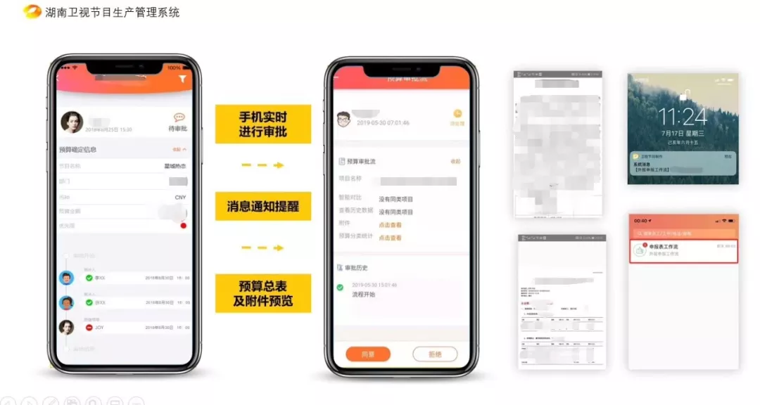 通过移动端能够进行外包和预算的审批,实现即时通知、平台人员即时通讯、项目支出录入和供应商、人员组织架构查询等功能。PC/移动端的实现,极大地提高了节目生产的工作效率,同时降低节目生产过程中人为因素导致的信息失误。