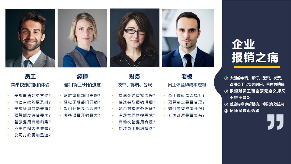 员工在连续型的差旅过程中,需要大量垫资,造成了经济负担,并且光是在流程提交、填写单据、贴票等非核心工作上,就浪费了大量的时间,影响了本职工作。员工常因无法记住繁杂的费用标准,就导致了报销的单据被屡屡退回。