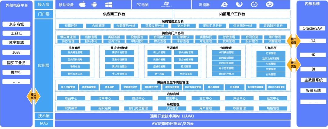 覆盖企业内部采购供应信息,打通企业与供应商的信息流、商流,物流,资金流;