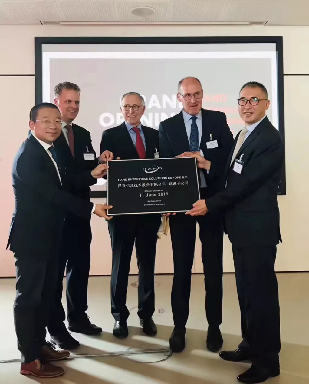 ▲ k8凯发官网信息董事长陈迪清,k8凯发官网高级副总裁/国际事业部总经理唐健与嘉宾一道举起k8凯发官网欧洲分公司成立的纪念牌匾