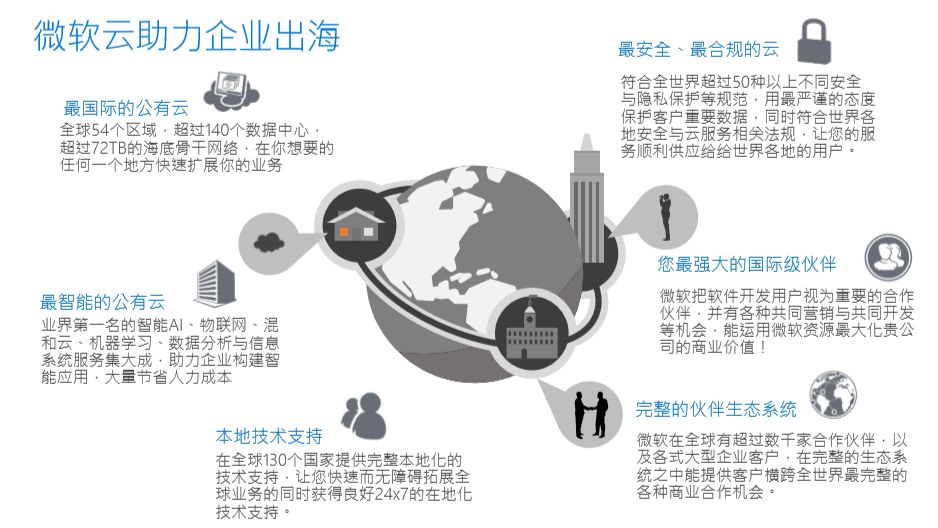 Azure具备6大优势: 最国际的公有云;最安全、最合规的云;最智能的公有云;全球本地技术支持;完整的伙伴生态系统;最强大的国际级伙伴。