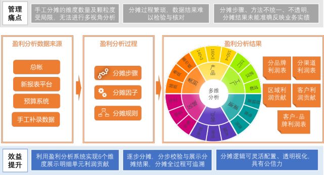 盈利分析可以将企业全成本(包括直接成本、间接成本、后台支持费用、管理/财务费用等)分摊到工厂、区域、品牌、产品、渠道、市场等多个管理维度。盈利分析的过程,也是一个对企业资源及业务流程重新梳理的过程。按照享用多少资源、分配多少费用的原则,制定出一套透明的、具有公信力的分摊规则。