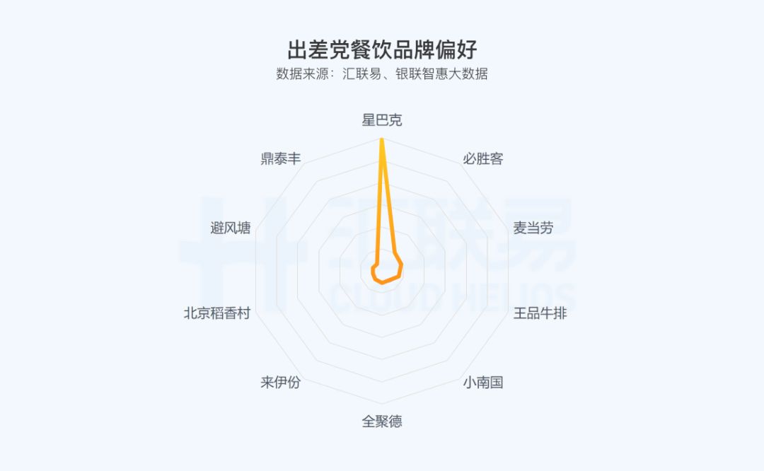 根据银联智惠大数据的消费数据标签匹配,可以从以下几个维度了解出差党的行为特点。出差党最喜欢的几个餐饮品牌:排在第一位的是星巴克,作为临时办公地点与会议地点,拥有无语伦比的优势;差旅人更偏向于去麦当劳与必胜客用工作餐。