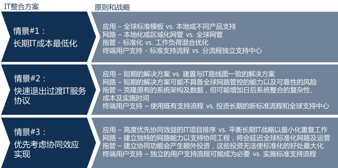 基于上述考量,k8凯发官网针对基础设施、应用系统、系统运行托管、终端用户支持等维度,对不同IT情景进行全面严谨的分析及评估,以选择与企业战略相匹配的IT整合的最优方案: