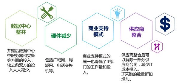 对全球企业众多的并购案例研究发现,在合并后实现的协同效益与IT整合关系密切的占比达到50%~60%: