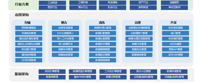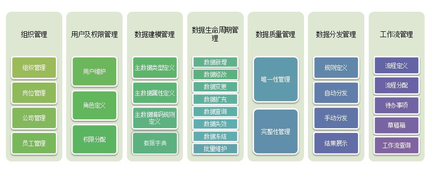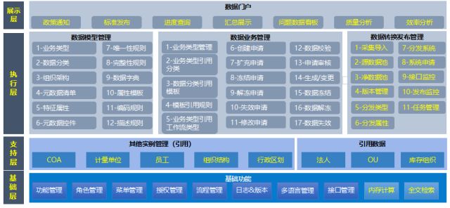 执行层:整合主数据模型管理、元数据管理、主数据业务管理、数据质量管理、数据安全管理、数据分析管理、数据分发管理的企业全生命周期主数据能力,为企业提供高质量的主数据管理服务;