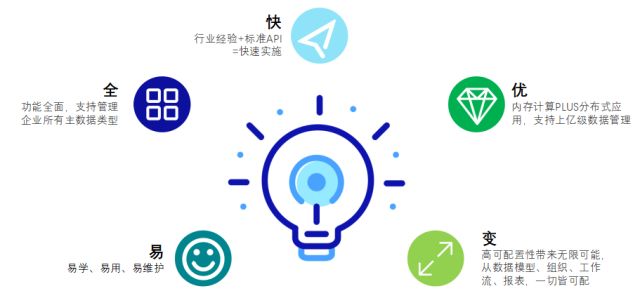 变:产品可配置程度非常高,可以配置任意类型的主数据,可以支持主数据域任意类型的非结构化数据的关联,也可以支持可配置的组织结构、工作流、报表、用户UI界面等。