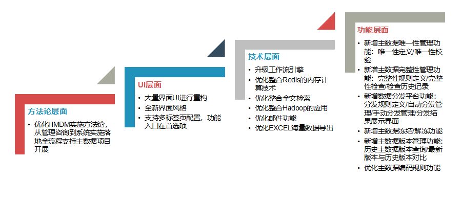 相比于V1.0,HMDM V2.0不仅仅实现了系统功能层面的提升与底层技术的优化,更深化了主数据项目实施方法论,以更好的支持主数据类项目的咨询与实施,方便顾问从宏观角度把控主数据项目质量。其中,HMDM V2.0主数据实施方法论:“三条主线”、“十大步骤”是本次升级中最核心最精华内容。