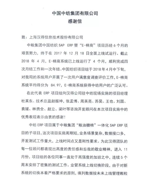 历经6个月的艰苦努力,中粮集团中国纺织SAP ERP 暨“E-棉商”项目终于在2017年12月18日全面上线试运行,并且项目上线4个月以来,E-棉商系统获得了中纺用户的广泛认可。