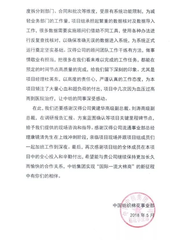 感谢项目组全体成员在本项目中的全心投入和辛勤付出,希望能与贵公司继续保持更加长久而愉快的合作关系,在中纺集团实现“国际一流大棉商”的新征程中继续有k8凯发官网相伴。