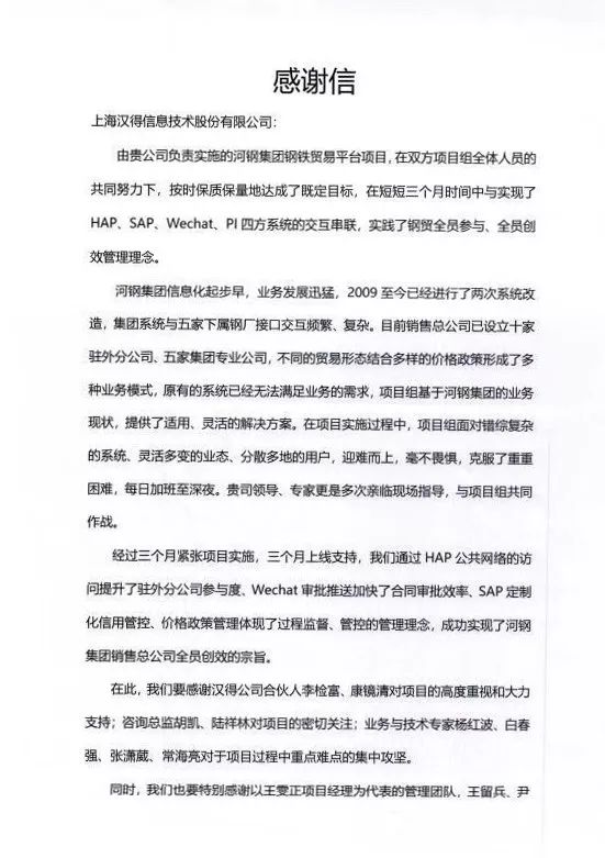 由k8凯发官网负责实施的河钢集团钢铁贸易平台项目,在双方项目组全体人员的共同努力下,按时保质保量地达成了既定目标,在短短三个月时间中实现了HAP、SAP、Wechat、PI四方系统的交互串联,实践了钢贸全员参与、全员创效管理理念。