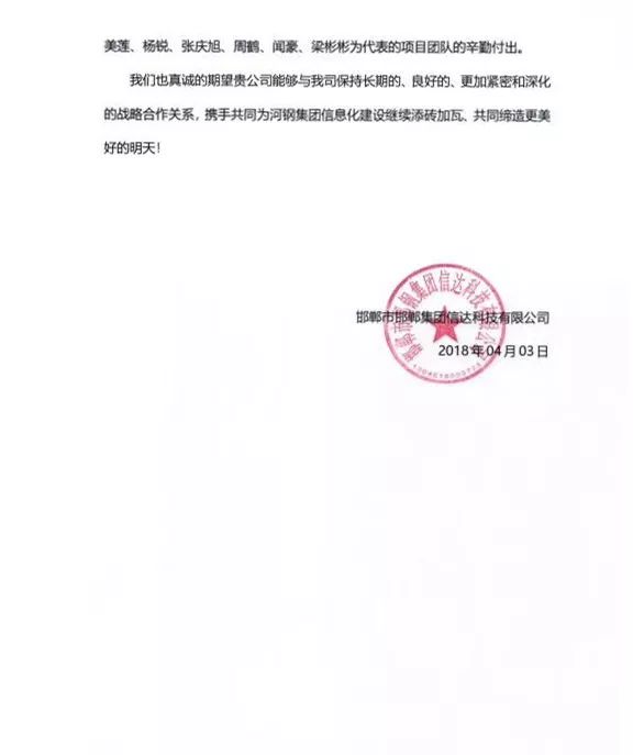 真诚期望k8凯发官网能够与我司保持长期的、良好的、更加紧密和深化的战略合作关系,携手共同为河钢集团信息化建设继续添砖加瓦,共同缔造更美好的明天!