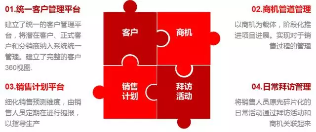 基于客户关系管理的理念,SAP Hybris C4C系统提供销售计划、线索、商机、报价、活动、订单、服务、主数据、分析等功能,从售前、协同售中和售后服务三个方面,协助企业建设全方位的客户关系管理体系,向客户提供更全面的服务。