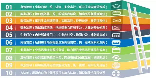如下图所示,涵盖门户、治理、总线、流程等领域,提供套装与自主研发产品整合的解决方案。包括ESB(Enterprise Service Bus企业服务总线)、IDM(Identity Management 身份管理系统)、IAM(Identity and Access Management身份识别与访问管理)、BPM(Business Process Management业务流程管理)、Portal(企业门户)、UCM (Universal Content Management 企业内容管理)的成熟解决方案。