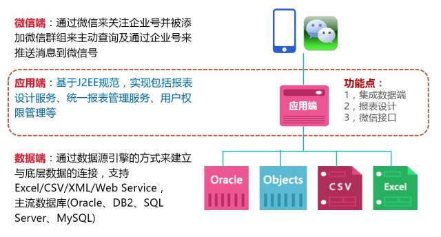 整体系统架构前端通过微信来关注企业号,并添加微信群组来主动查询或通过企业号接收消息。应用端基于J2EE规范,实现报表设计服务、统一报表管理服务、用户权限管理等。数据端通过数据源引擎的方式来建立与底层数据的连接,支持Excel/CSV/XML/Web Service及主流数据库(Oracle、DB2、SQL Server、SAP HANA等)。