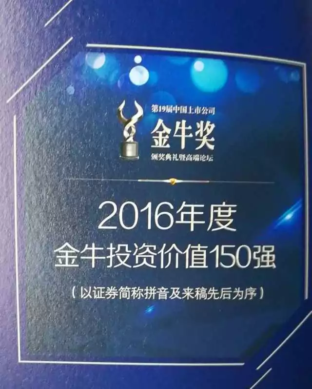 已成功举办了十九届的中国上市公司金牛奖以其在业内的权威性和含金量,堪称上市公司领域的“小金人”。根据赛弥斯(Themis)纯定量异常值评级技术对上市公司财务安全做出客观评价,剔除出财务安全显著恶化以及财务安全风险度较高的上市公司,并采用主成分分析方法对上市公司财务指标进行优化排序。本次评选看重上市公司持续的盈利能力和稳定的投资回报,比对同行上市公司市盈率(市盈率按照2016年利润计算),最终共有139家企业在列。