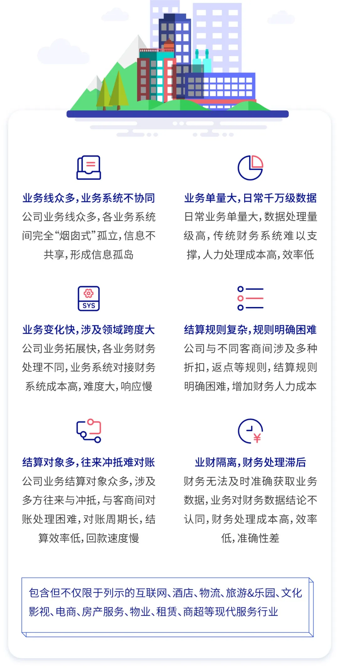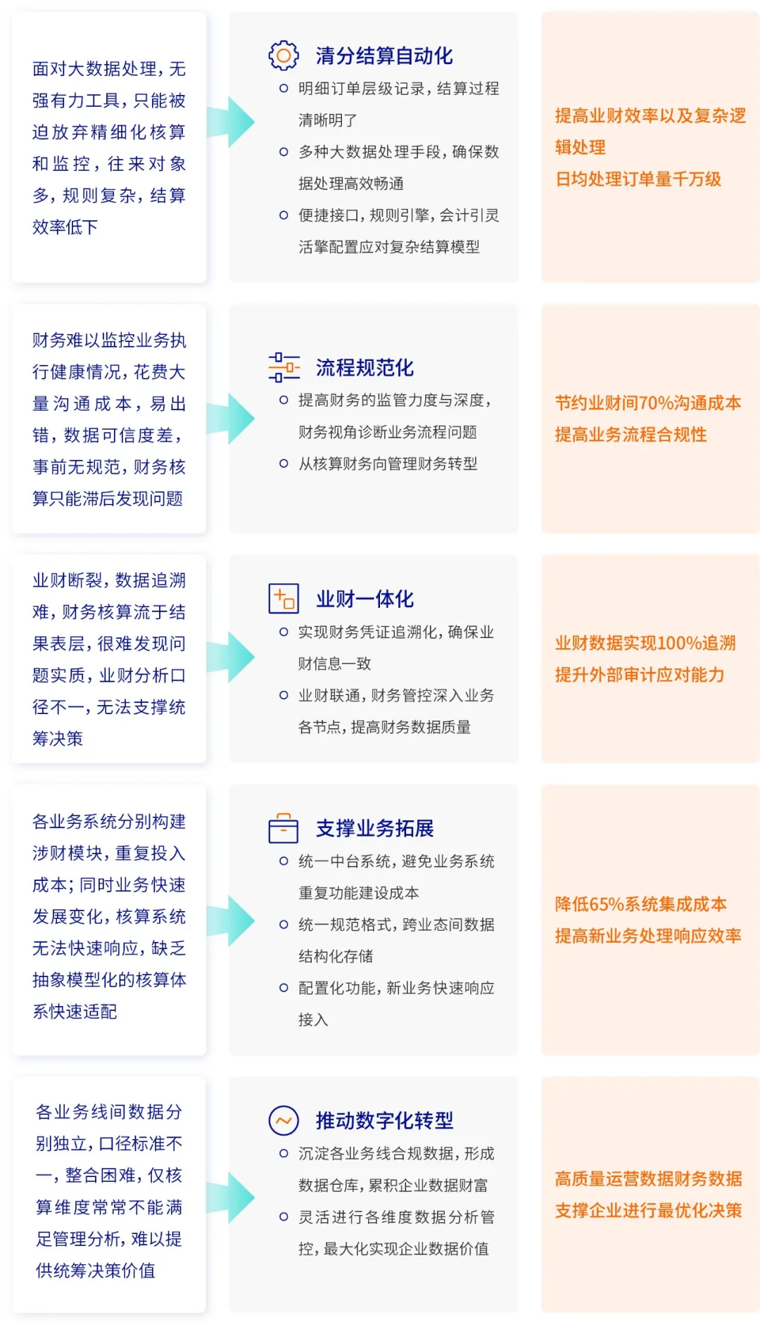 简单地将前台业务与财务大后台直接/间接串联,将使得财务核算复杂且低效,未来投入成本越来越高,业务IT也怨声载道。这在服务业(包括绝大部分的互联网企业)尤为突出。