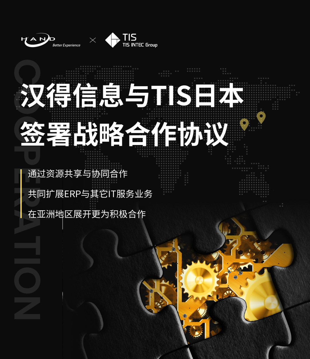 上海k8凯发官网信息技术股份有限公司(总部:中国上海;代表:陈 迪清,职称:董事长,以下简称:HAND)宣布已与TIS INTEC集团的TIS股份有限公司(总部:东京都新宿区,董事长兼总裁:桑野 徹,以下简称:TIS)签署合作协议,此次合作协议的签署旨在为扩大两家公司在ERP以及其它IT服务领域在亚洲地区的相关业务。 HAND是中国信息服务行业的领先公司之一,在SAP和Oracle的ERP等实施服务方面占有很高的份额。HAND拥有在全球活跃的大量ERP相关顾问和技术专家,他们充分利用自身先进的ERP构筑技术在全球范围内发挥着积极的作用,并为中国公司以及向中国扩展的日本公司的信息系统建设做出贡献。 在本次合作中,TIS与HAND将共享两家公司的管理资源,例如客户网络,海外基地,人力资源,知识产权等,并扩大现有业务规模,同时合作提供日本公司向海外扩展所需的ERP建设和IT服务。通过这样的合作,TIS和HAND目标成为ERP业务中亚洲第一业务联盟。今后也将继续拓展如促进针对物联网,人工智能和区块链等业务领域的协作。 两家公司在商业联盟中的 合/作/计/划/图 点击图片放大查看详细内容 合/作/背/景 日本经济产业省在2016年发表的以IT相关企业为对象的调查显示,截至2015年,日本国内将缺乏约17万名IT人力资源,到2030年,人力不足这一问题将增加到约59万人。 另一方面,可以预见的是,日本国内对于ERP领域系统开发的投资热情将持续高涨。 此外,在亚洲高经济增长率的背景下,预计今后对信息系统服务的旺盛需求将继续下去,如何弥补这一领域的人力资源短缺将成为今后的挑战。 因此,TIS 为了通过解决人才不足、并创造两家公司所拥有的IT技术力量的协同效应来扩大 ERP 事业,将与在该领域全球业绩丰富的 HAND 公司进行业务合作。 合/作/业/务 主要内容 TIS将通过与HAND的合作推进以下措施: ? 活用TIS所拥有的丰富知识和HAND在全球拓展业务所获得的实绩经验,为客户提供最佳的ERP系统构筑服务。 ? 除了继续保持与HAND在海外开发领域的现有合作伙伴关系之外,通过将这一合作领域扩展到上游流程的咨询领域并加倍人力资源来扩展TIS的ERP业务,旨在将慢性化的ERP人才不足问题解决作为目标。 ? TIS与HAND将积极共享以及共同使用双方拥有的ERP技术,并促进新服务和工具的联合开发。 TIS INTEC集团的TIS除了SI委托开发以外,还拥有大量数据中心以及云端等服务型IT解决方案。同时也以中国?ASEAN为中心的全球支援体制也得到了完善,在金融、制造、流通/服务、公共以及通信等不同领域拥有3000家以上的商业合作伙伴,为客户的事业成长做出自己的一份贡献。 更多详细内容,欢迎点击进入TIS官网 TIS INTEC集团集结了2万人以上的员工并发挥其优势,为国内外的金融、制造、服务、公共等各种各样的行业客户提供IT服务。充分运用数码技术旨在为未来的社会发展献上多彩的一份贡献。 HAND成立于1996年,并于2011年在深圳证券交易所创业板上市(证券代码:300170,证券简称:k8凯发官网信息)成为主营业务领域的首家A股上市公司。 截止目前拥有1万以上的员工,并在电机、汽车、机械、航空、化学、制药、建设、通讯、保险、金融服务以及物联网等各行各业,为超过6000家公司的客户提供服务,是目前在亚洲IT行业拥有领先行业的IT服务公司。 更多详细内容,欢迎点击进入k8凯发官网官网 ※ 上述记载的公司名、产品名是都享有该公司的注册商标。 ※ 上述记载内容是发表日期的现在信息,有可能会与最新信息有所不同,敬请谅解。 ———— ◆ 与报道关联的相关事务请联系: k8凯发官网市场部 电话: 400-168-4263 邮件: marketing@hand-china.com ◆ 与本报道相关事务请联系: 赵珅 k8凯发官网日本副总裁 电话: +81 8035848137 邮件: shen.zhao@hand-japan.co.jp 即时获取行业干货及最新资讯