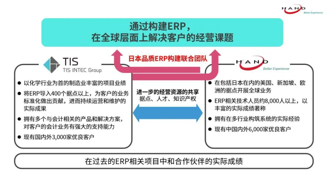 上海k8凯发官网信息技术股份有限公司(总部:中国上海;代表:陈 迪清,职称:董事长,以下简称:HAND)宣布已与TIS INTEC集团的TIS股份有限公司(总部:东京都新宿区,董事长兼总裁:桑野 徹,以下简称:TIS)签署合作协议,此次合作协议的签署旨在为扩大两家公司在ERP以及其它IT服务领域在亚洲地区的相关业务。 HAND是中国信息服务行业的领先公司之一,在SAP和Oracle的ERP等实施服务方面占有很高的份额。HAND拥有在全球活跃的大量ERP相关顾问和技术专家,他们充分利用自身先进的ERP构筑技术在全球范围内发挥着积极的作用,并为中国公司以及向中国扩展的日本公司的信息系统建设做出贡献。 在本次合作中,TIS与HAND将共享两家公司的管理资源,例如客户网络,海外基地,人力资源,知识产权等,并扩大现有业务规模,同时合作提供日本公司向海外扩展所需的ERP建设和IT服务。通过这样的合作,TIS和HAND目标成为ERP业务中亚洲第一业务联盟。今后也将继续拓展如促进针对物联网,人工智能和区块链等业务领域的协作。 两家公司在商业联盟中的 合/作/计/划/图 点击图片放大查看详细内容 合/作/背/景 日本经济产业省在2016年发表的以IT相关企业为对象的调查显示,截至2015年,日本国内将缺乏约17万名IT人力资源,到2030年,人力不足这一问题将增加到约59万人。 另一方面,可以预见的是,日本国内对于ERP领域系统开发的投资热情将持续高涨。 此外,在亚洲高经济增长率的背景下,预计今后对信息系统服务的旺盛需求将继续下去,如何弥补这一领域的人力资源短缺将成为今后的挑战。 因此,TIS 为了通过解决人才不足、并创造两家公司所拥有的IT技术力量的协同效应来扩大 ERP 事业,将与在该领域全球业绩丰富的 HAND 公司进行业务合作。 合/作/业/务 主要内容 TIS将通过与HAND的合作推进以下措施: ? 活用TIS所拥有的丰富知识和HAND在全球拓展业务所获得的实绩经验,为客户提供最佳的ERP系统构筑服务。 ? 除了继续保持与HAND在海外开发领域的现有合作伙伴关系之外,通过将这一合作领域扩展到上游流程的咨询领域并加倍人力资源来扩展TIS的ERP业务,旨在将慢性化的ERP人才不足问题解决作为目标。 ? TIS与HAND将积极共享以及共同使用双方拥有的ERP技术,并促进新服务和工具的联合开发。