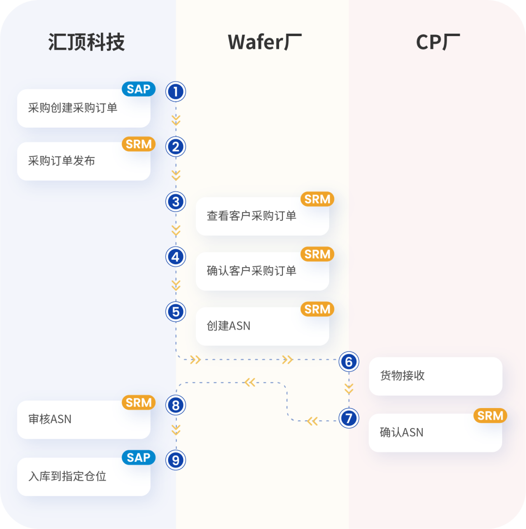 晶圆供应商完工发货时,通过SRM门户创建交货单,由汇顶采购/仓库进行在线确认,下游加工厂如CP厂接收晶圆后进行交货单确认,汇顶仓库确认后完成库存入帐到ERP更新库存数据。