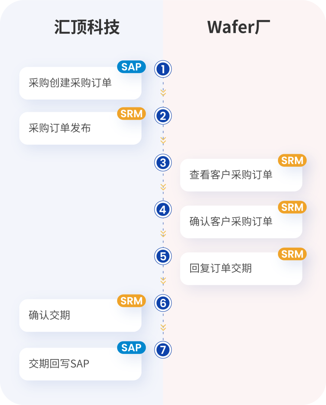 ERP下达晶圆采购订单,审批后同步至SRM系统,供应商通过SRM门户进行订单确认及交期回复。