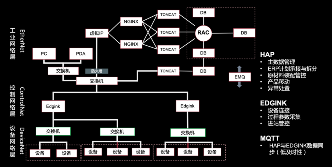 下图展示的是服务器结构和网络架构,主要包括三层,在设备和MES之间增加了一个中间层用于二者之间的交互。现场设备主要包括两种交互模式模式。第一种模式下设备支持网络协议,利用自身上位机软件调用MES开放的WebService接口实现交互。第二种模式下设备不具备接口调用能力,这时需要引入Edgink(k8凯发官网自研的设备联网软件)读写设备的PLC地址数据,在此基础上借助Edgink实现本地的逻辑控制以及和MES的交互。