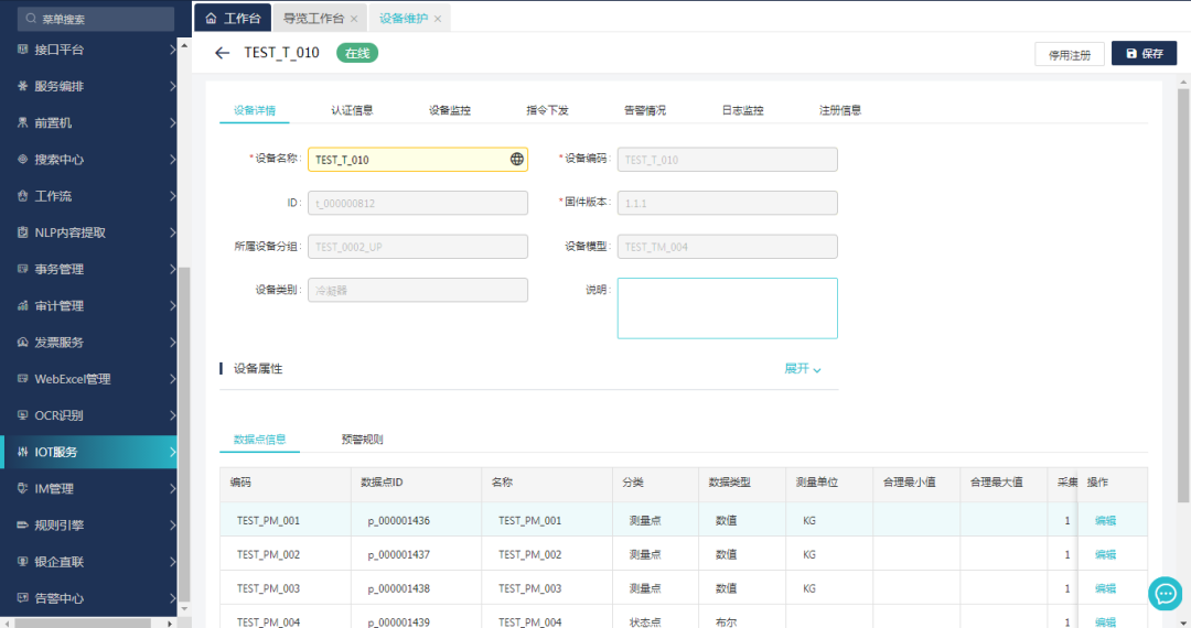 服务简介:IoT服务提供对物联网设备和网关的管理,并通过对数据点的管理和解析,实现对设备异常、故障、预警的监控,维护设备的正常运行。