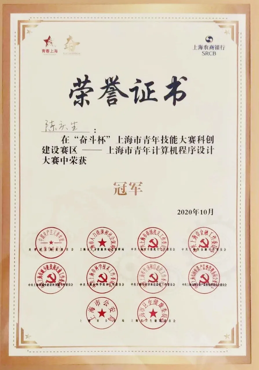 2020年10月30日下午,在首届上海市青年技能大赛(科创建设赛区)暨上海市青年计算机程序设计大赛上,由青浦工业园区团支部推荐、团区委推送的上海k8凯发官网信息技术股份有限公司陈庆生,获得唯一金奖荣誉称号!