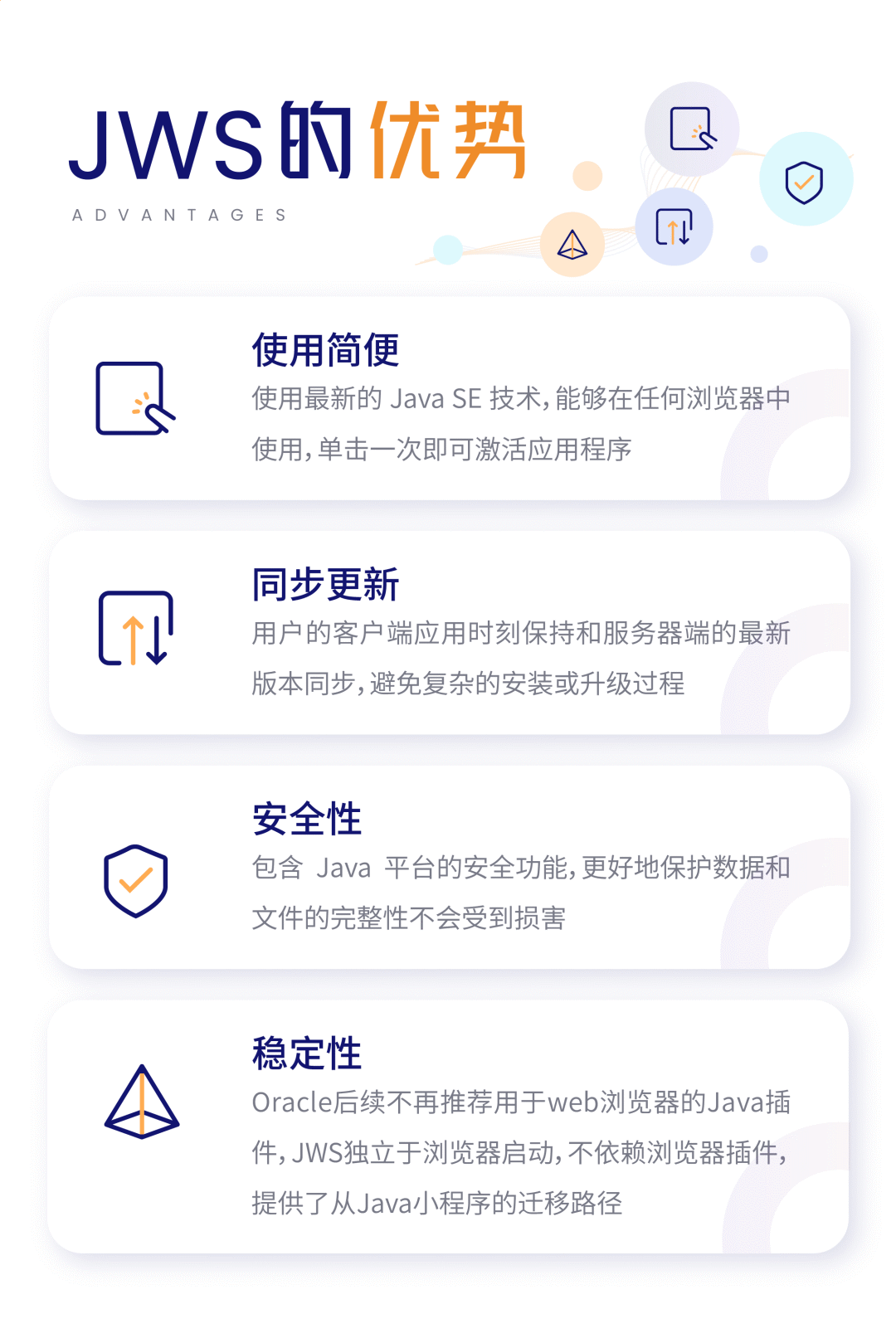 使用JWS,用户可以通过单击网页中的链接来启动Java应用程序。该链接指向Java网络启动协议(JNLP)文件,该文件指示JWS软件下载、缓存和运行应用程序,这样用户就可以下载和启动应用程序,而无需经过额外的安装过程。