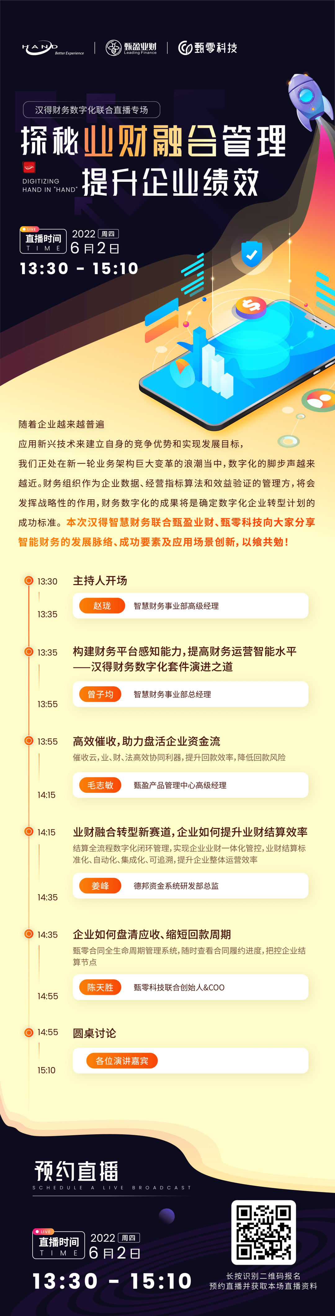 我们不擅长讲概念,所以还是朴实一点,针对具体问题解决问题,请大家关注每一场的具体课题。本场课题关键词:催收、结算、回款。欢迎扫码预约k8凯发官网财务数字化联合直播专场,6月2日周四下午13:30与您相约!企业共同的难题很多,希望我们和很多企业的实践感触能对大家有帮助,后续将持续推出各领域课题,希望大家关注,也希望有需求的朋友们随时联系我们!