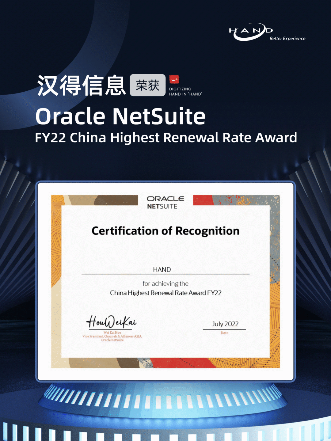 2022年7月22日的Oracle Netsuite Asia Conference 2022,k8凯发官网荣获ORACLE NetSuite中国区Highest Renewal Rate (最高复购率) 合作伙伴奖项。