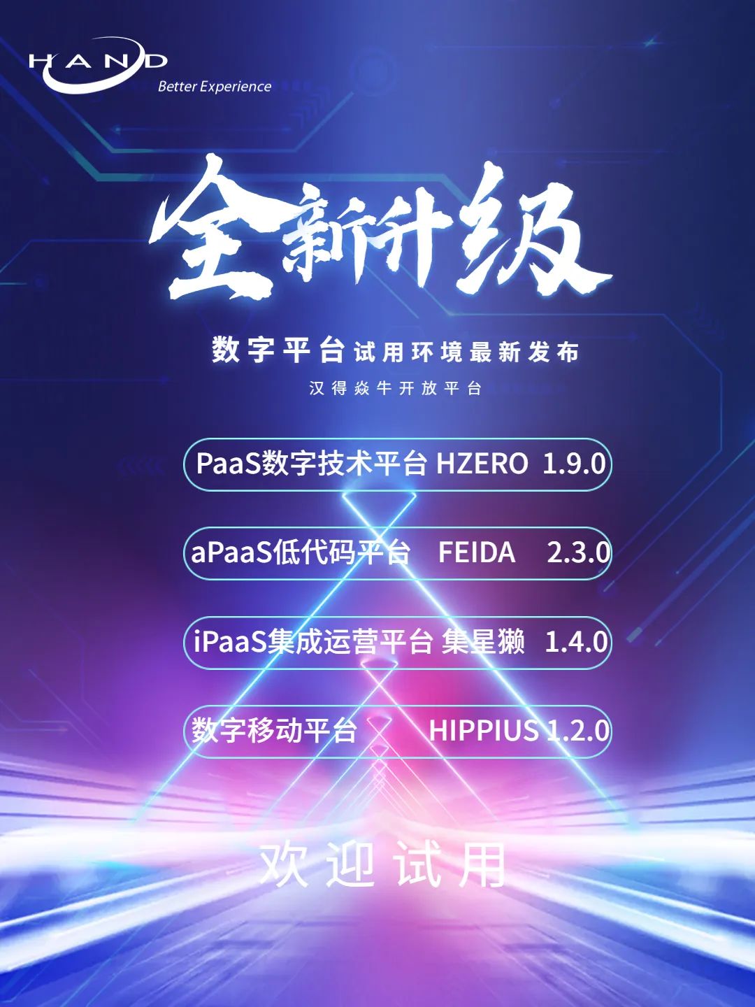 为提供更好的客户体验,数字平台试用环境已进行全新升级,现正式对外发布,本次试用环境升级包括HZERO企业级PaaS平台试用环境、aPaaS低代码平台飞搭试用环境、iPaaS集成运营平台集星獭、数字移动平台海马汇试用环境。