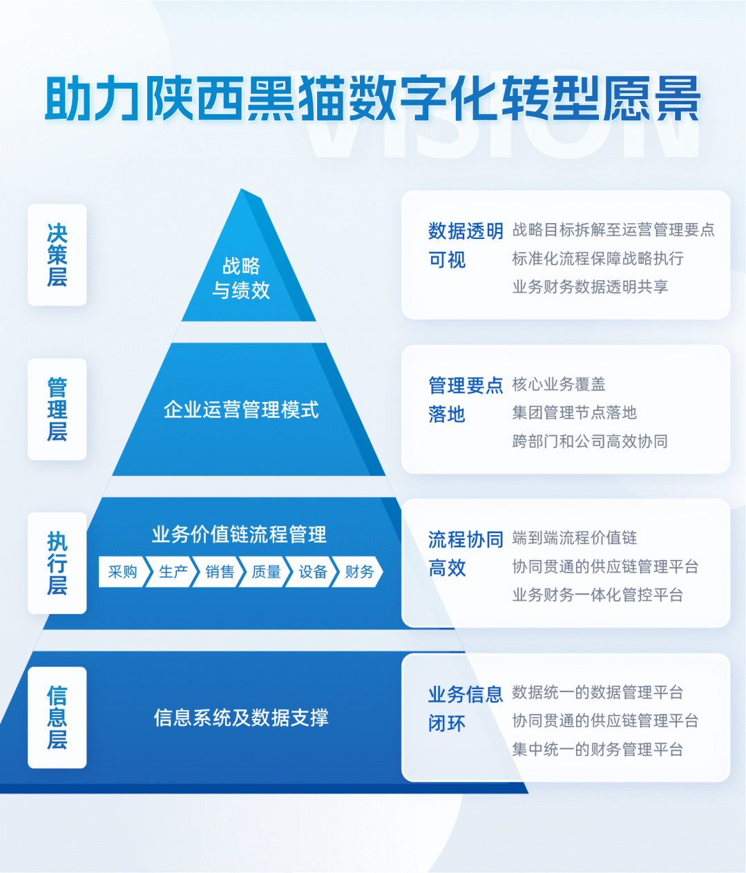同时,通过以项目为契机,更新集团内部各个层级对于信息化的认知,提升各级业务人员的信息化能力和水平,培养出黑猫自己的各级信息化支持人员。