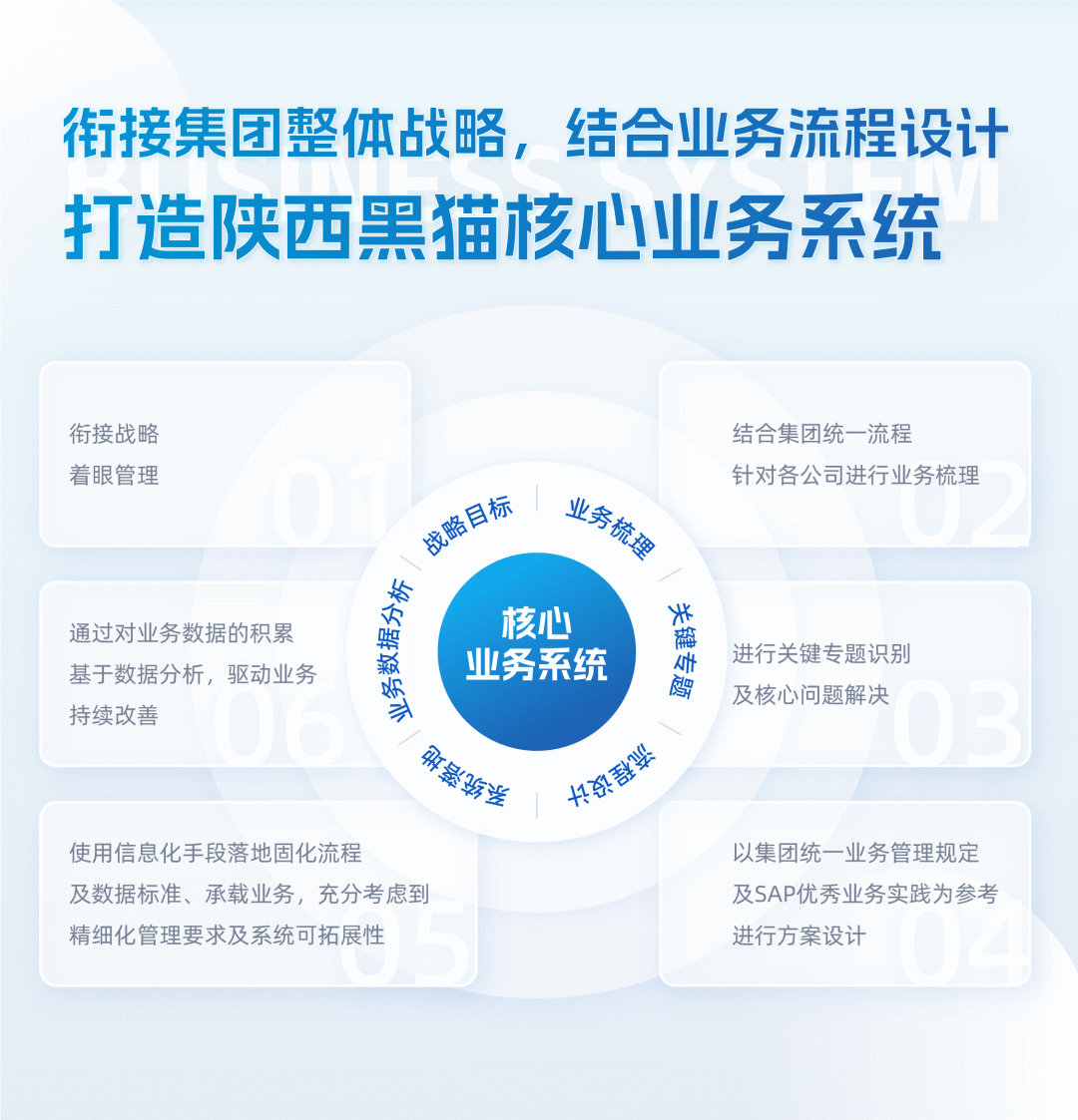 通过系统实施,并结合SAP行业优秀实践与黑猫业务实况,建立一套完整、标准化的业务蓝图模板,将流程进行系统固化,切实提升集团的业务规范程度和管控能力。